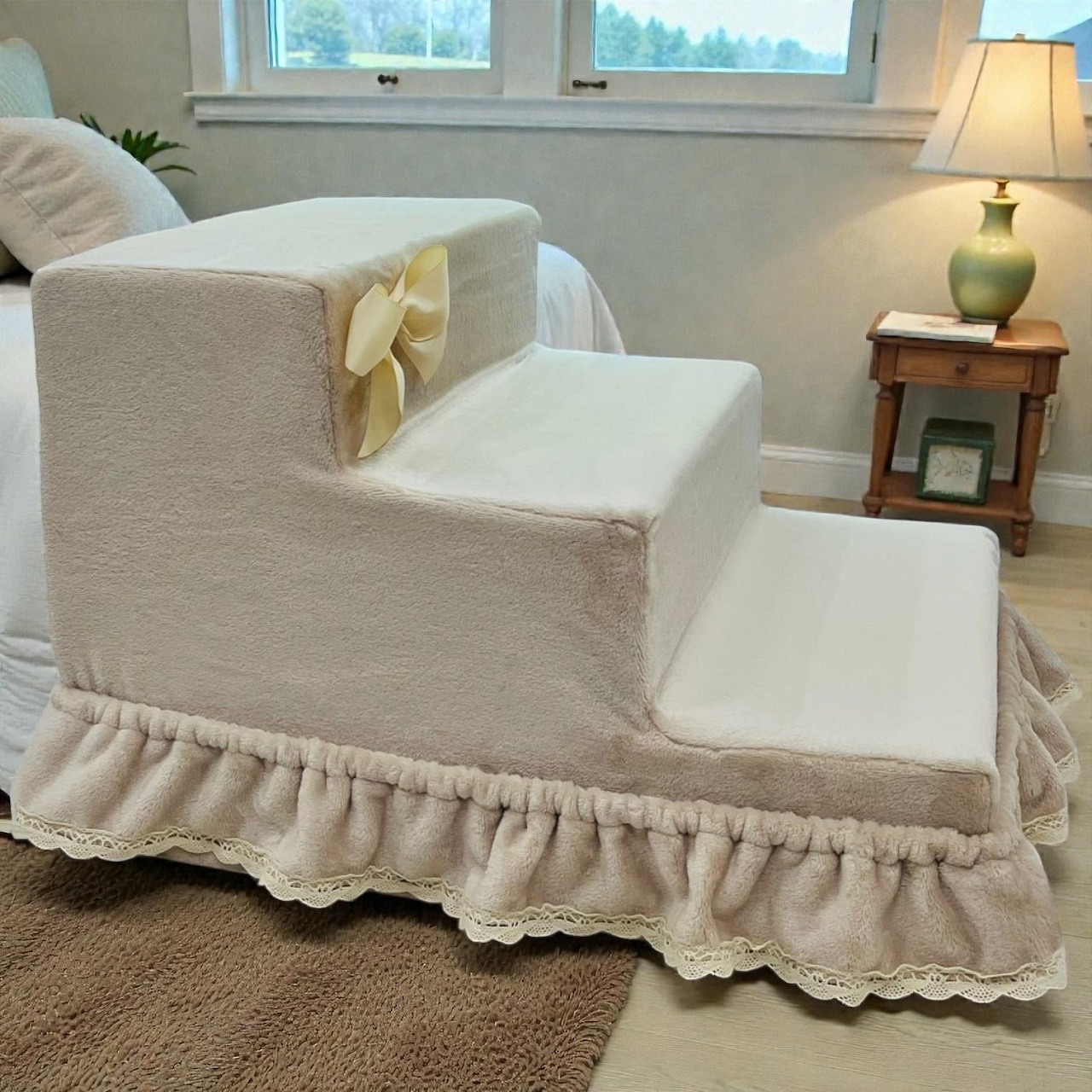 Стильная лестница для собак из мягкого плюшевого меха, декорированная съемной меховой рюшей с маленьким кремовым кружевом.